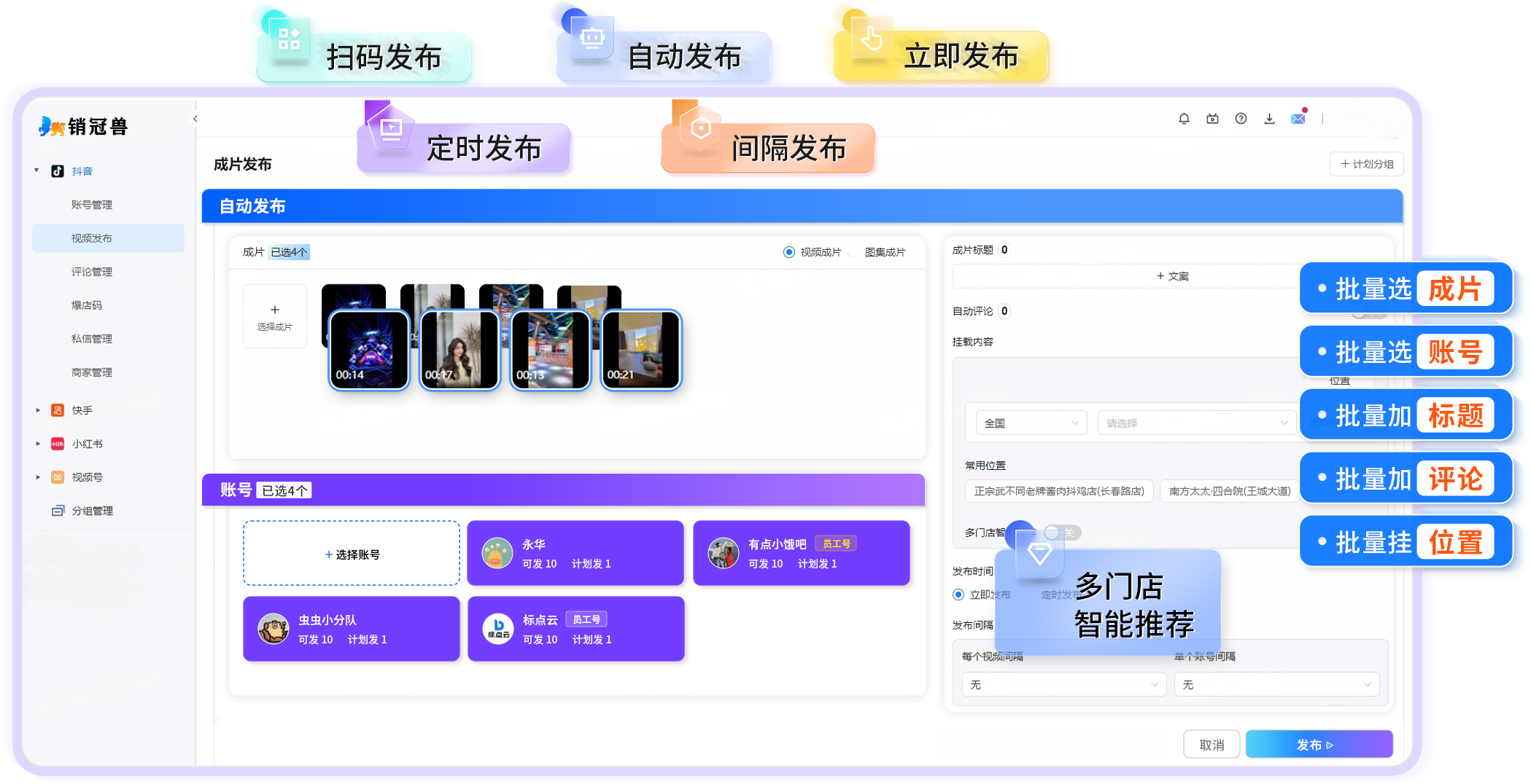 某连锁美容品牌借销冠兽绑定259个账号,1人统管全国门店账号,AI 混剪每月储备3000+条视频,1024条视频曝光超1110万次,批量挂载门店POI提升成交,破解运营难题!